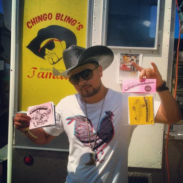 ChingoZine releases issues of their zine twice a year, and they now have a toy line called Chingolandia. The first edition of 3 hand-painted resin toys Don Raspa (my favorite,) Mapache Bear, and the Great State of Tejas are all available on their site.